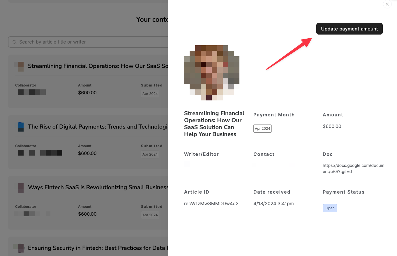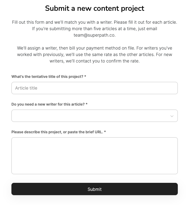 API access for enterprise customers. This means we connect the customer's content production tool directly to Superpath via a webhook. Those customers work in their own tool (Airtable, Asana, etc.) rather than submitting content through our portal. (Shoot me an email if you want to set that up for your own team.)