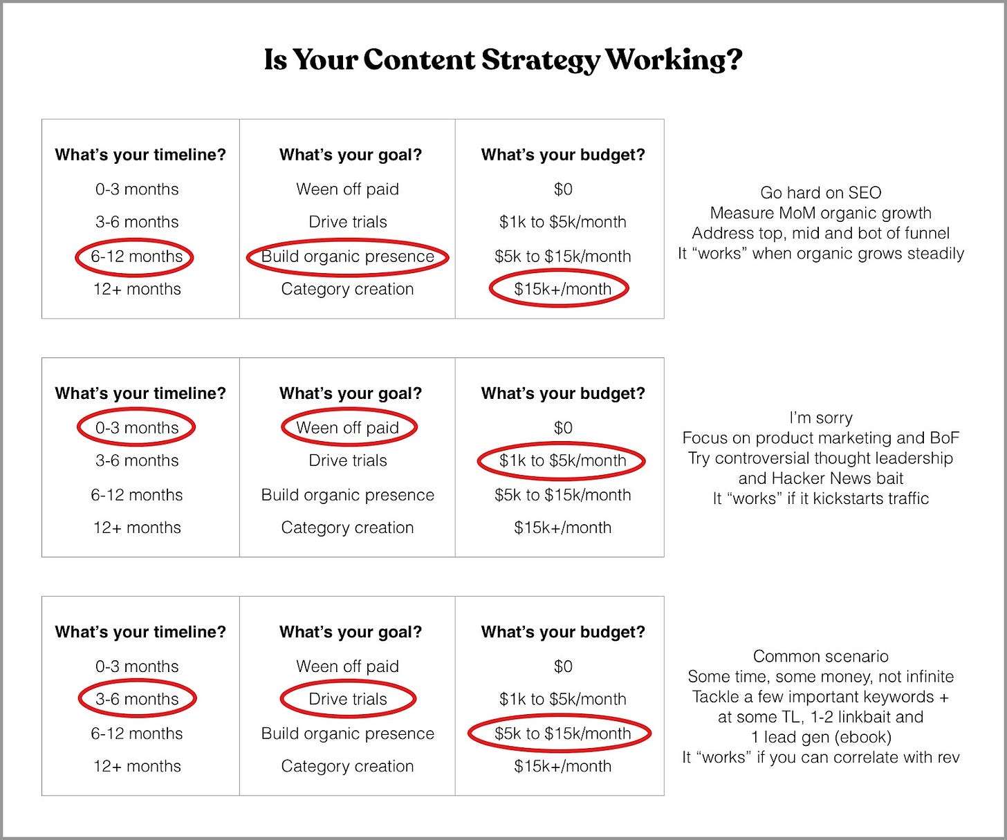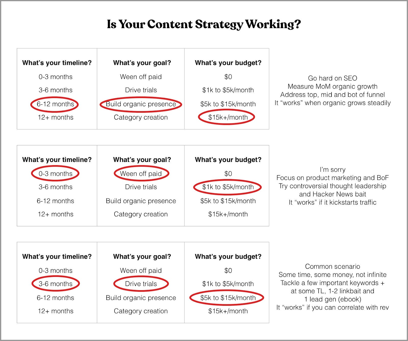 Is it supposed to work yet? I’ll add one caveat to the above point. If, for example, the business grows on the heels of word-of-mouth and/or paid acquisition, you might have a longer runway to execute your content strategy. Let’s say you work for a marketing technology company in a crowded market. Paid acquisition works but keeps getting more expensive. You can wean off paid acquisition by investing in organic growth. Although it will take time, you must constantly check your progress against the cost of paid acquisition. You need to know how much time you have. You can’t build a strong organic presence in two months, but you likely could in 12 months. If you can confidently say you have 12 months of runway, use that long-term thinking to your advantage. Build a strong organic foundation first, and worry about conversion-specific metrics later.
