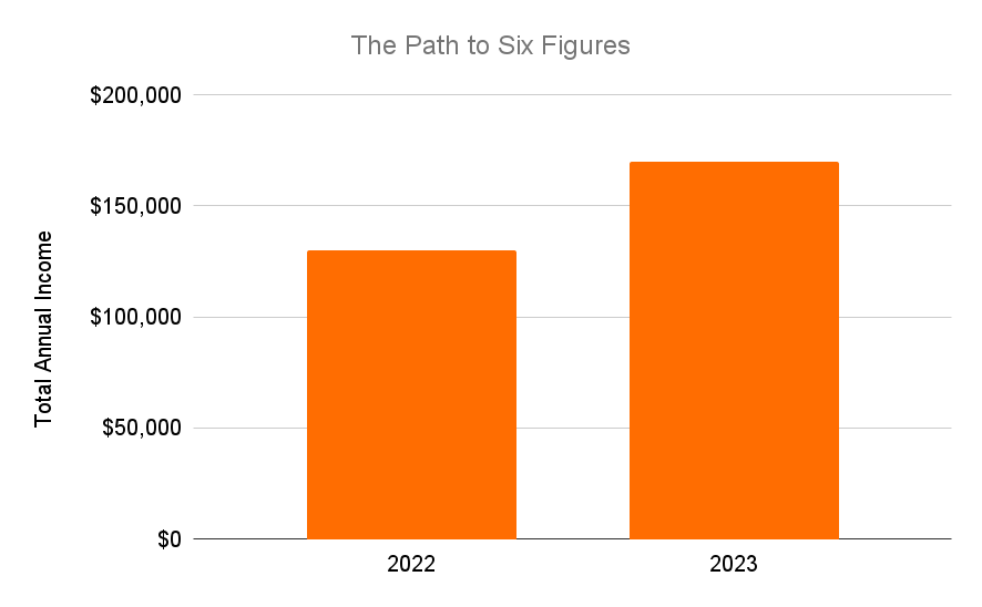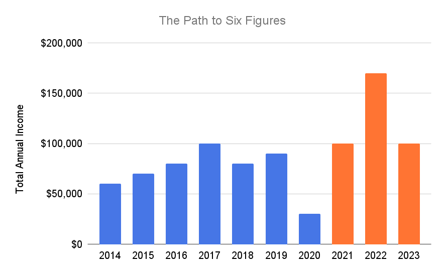 The biggest salary jump I made in my freelance career was in 2022 when I scored on full year contract worth $60,000 and was on the market looking for full-time jobs and a number of companies I didn't end up accepting a role from wanted to work with me on a freelance basis. I made $170,000 that year (more than I was making at my job) but it was too much work with a full-time job.